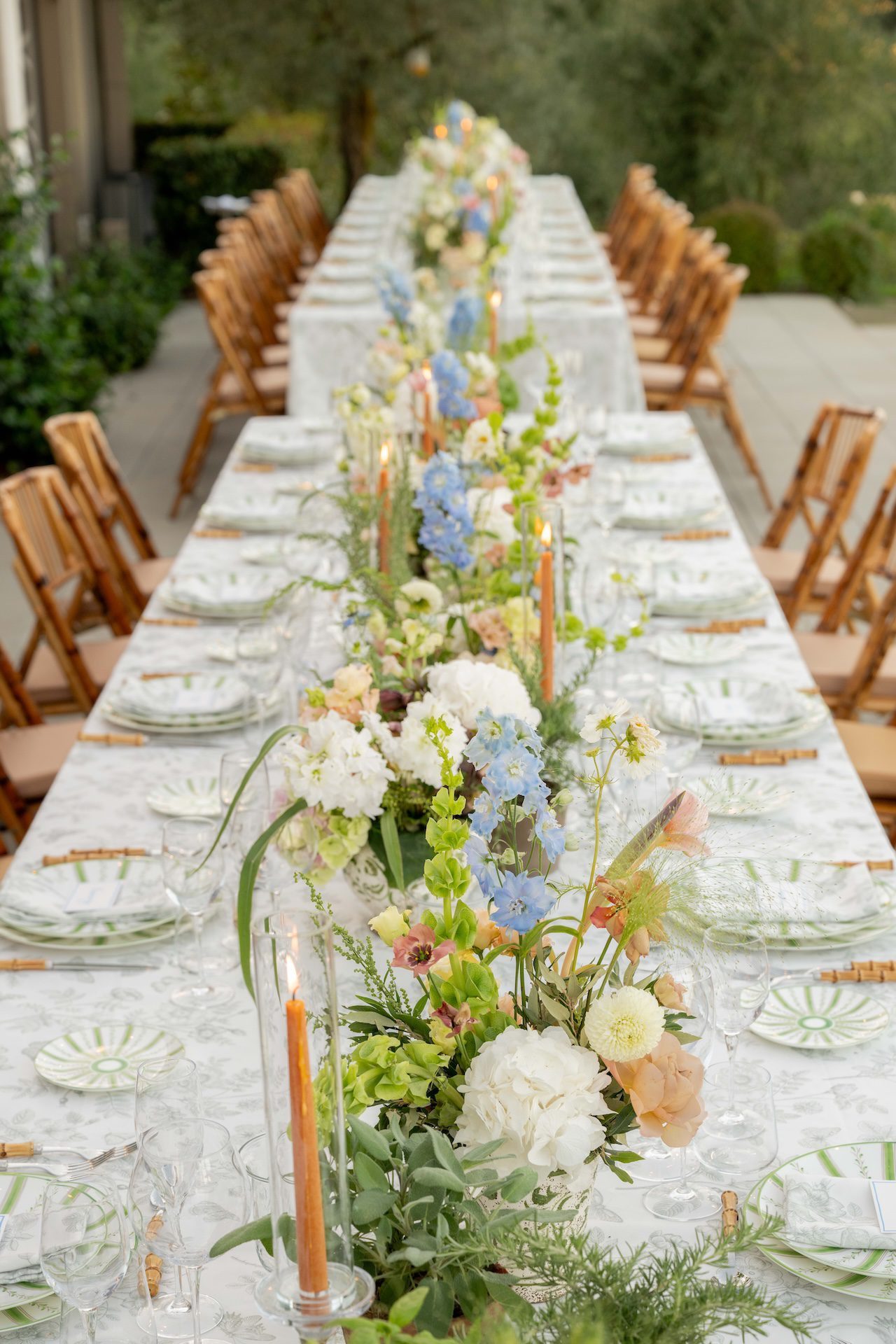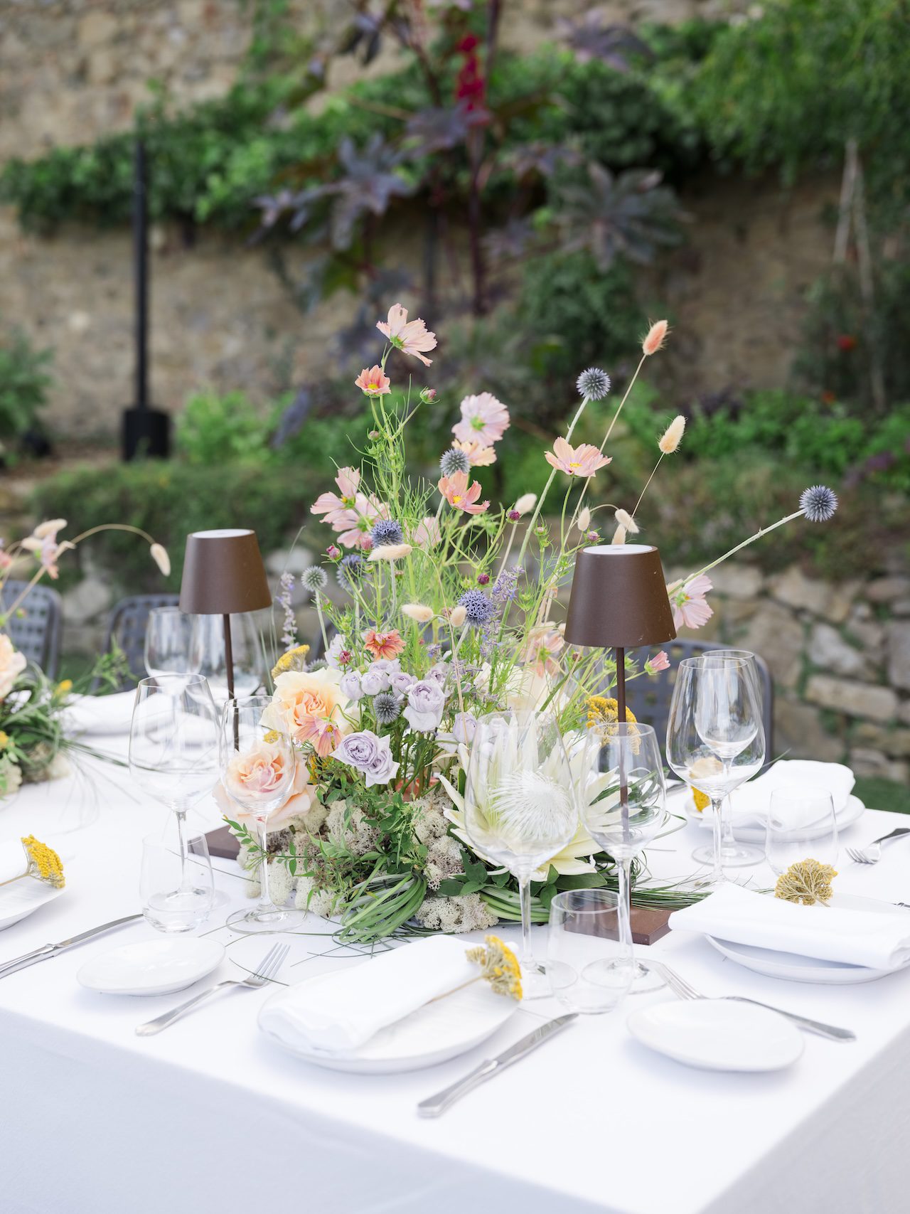 Tuttavia, il cambiamento più significativo riguarda l'illuminazione. Le lampade da tavolo stanno sostituendo (o integrando) le tradizionali lucine sospese e gli alti candelabri. Piccole lampade di design, senza fili, posizionate direttamente sui tavoli, creano un "bagliore" caldo e intimo ad altezza occhi. È un tocco sofisticato che trasforma un maestoso cortile italiano in una accogliente terrazza privata.